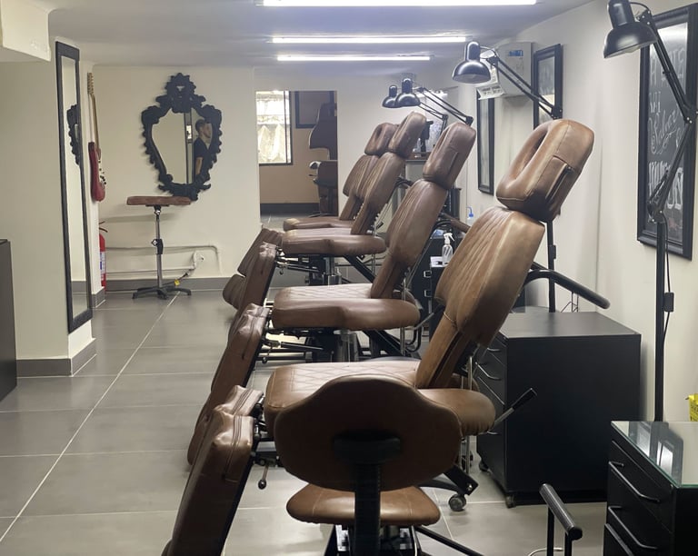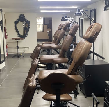 Mobiliário de Performance: Esqueça o padrão comum. Nosso estúdio conta com mobiliário ergonômico de última geração, pensado para que as sessões — curtas ou longas — sejam uma experiência de máximo conforto tanto para o cliente quanto para o artista. Cada detalhe foi escolhido para garantir biossegurança impecável e uma estética industrial sofisticada.